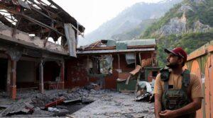 A Pakistan army soldier is located at the facilities of the Bilal Mosque, after he was beaten by an Indian strike in Muzaffrabad, Azad Jammu and…