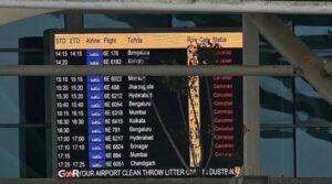 A screen that shows canceled flights is shown at the Indira Gandhi International Airport after a part of the terminal roof collapsed after heavy…