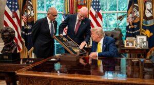President Donald Trump speaks with FIFA president, Gianni Infantino, while meeting members of the Juventus Football Club at the Oval Office,…