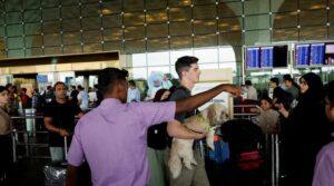 A volunteer guides passengers to their respective doors after several airlines had flight delays after an important technical problem hit the…