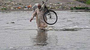 A man carries his bicycle while won by a road flooded after heavy monsoon rains in Karachi on August 20, 2025. – AFP PDMA KP warns the…