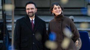New York Mayor Zohran Mamdani and his wife Rama Duwaji smile as confetti falls after his mayoral swearing-in ceremony at City Hall on January 1,…