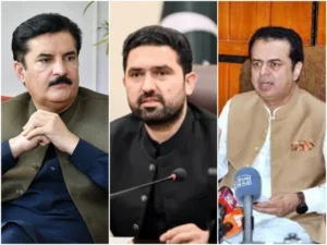 Governor Faisal Karim Kundi (from left), Chief Minister Sohail Afridi (centre) and Minister of State for Home Affairs Talal Chaudhry. Photo: Archives…