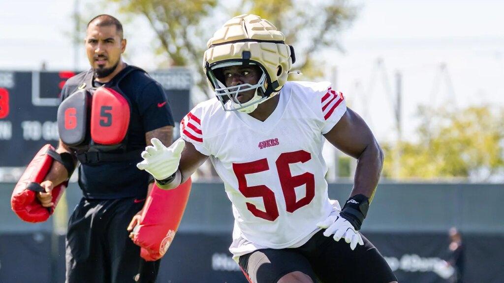 The defensive line of the San Francisco 49ers, Tarron Jackson, #56, does an exercise during the San Francisco 49ers training camp on July 23, 2025 at SAP performance facilities in Santa Clara, California. (Matthew Huang/Icon Sportswire through Getty Images)