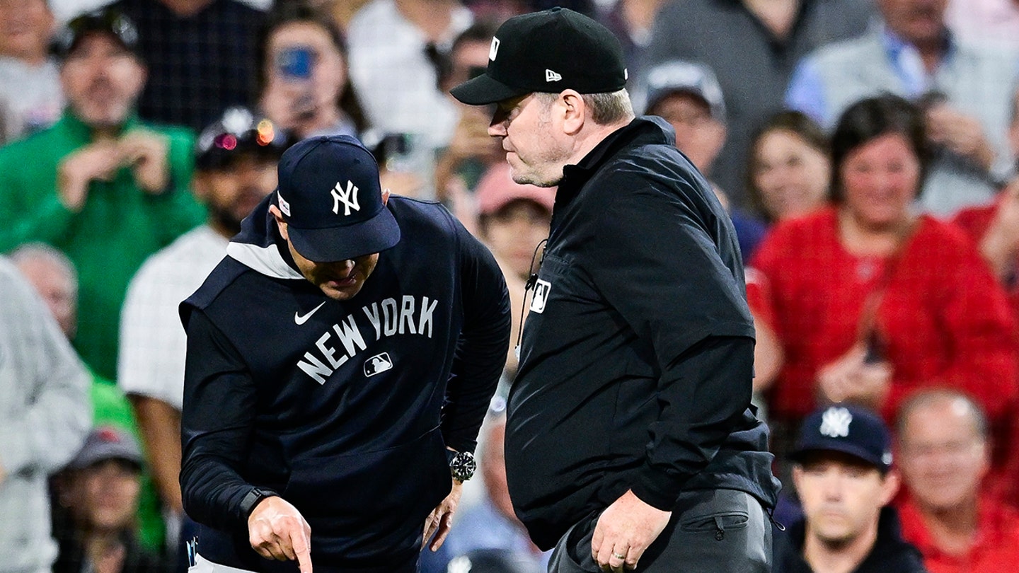 The New York Yankees manager, Aaron Boone, has words with the referees in the tenth entry of a game against the Red Boston socks in Fenway Park on June 13, 2025. (David Butler II/Imagn images)