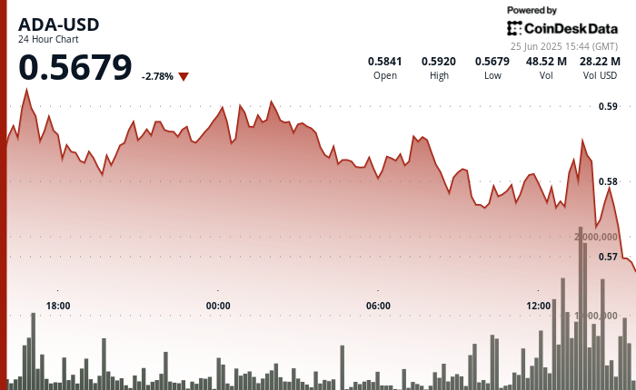 The Token is quoted at $ 0.5679, 2.78% less in the last 24 hours, after eraseing a previous price rebound, according to the technical analysis model of Coindesk Research.