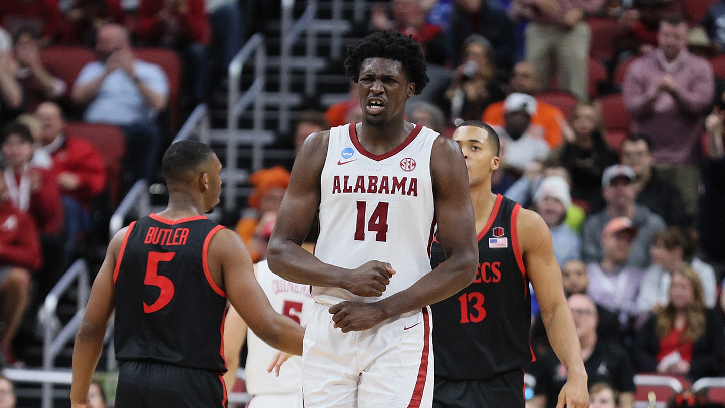Charles Bediako of the Alabama Crimson Tide reacts during the second half of the Sweet 16 round of the NCAA Men’s Basketball Tournament at KFC YUM! Center against the San Diego State Aztecs on March 24, 2023 in Louisville, Kentucky. (Andy Lyons/Getty Images)
