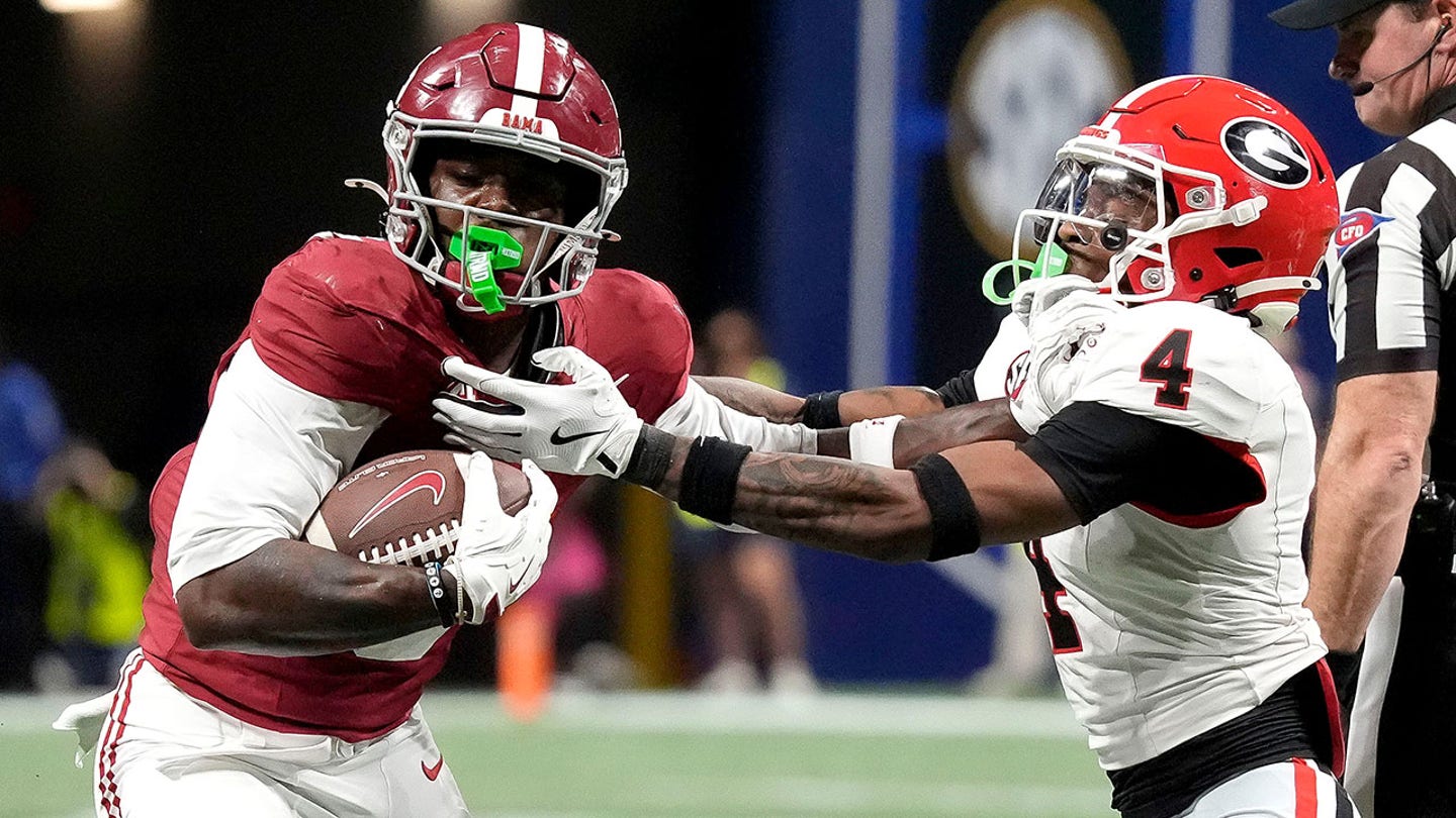 Alabama wide receiver Germie Bernard (5) uses a stiff arm to break up a tackle by Georgia defensive back KJ Bolden (4) at Mercedes-Benz Stadium in Atlanta, Georgia, on December 6, 2025. (Gary Cosby Jr./Tuscaloosa News)