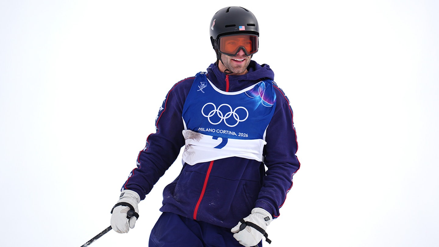 Alex Hall of the United States looks on after falling during the men’s freestyle skiing finals at the 2026 Winter Olympics in Livigno, Italy, Tuesday, Feb. 10, 2026. (AP Photo/Abbie Parr)