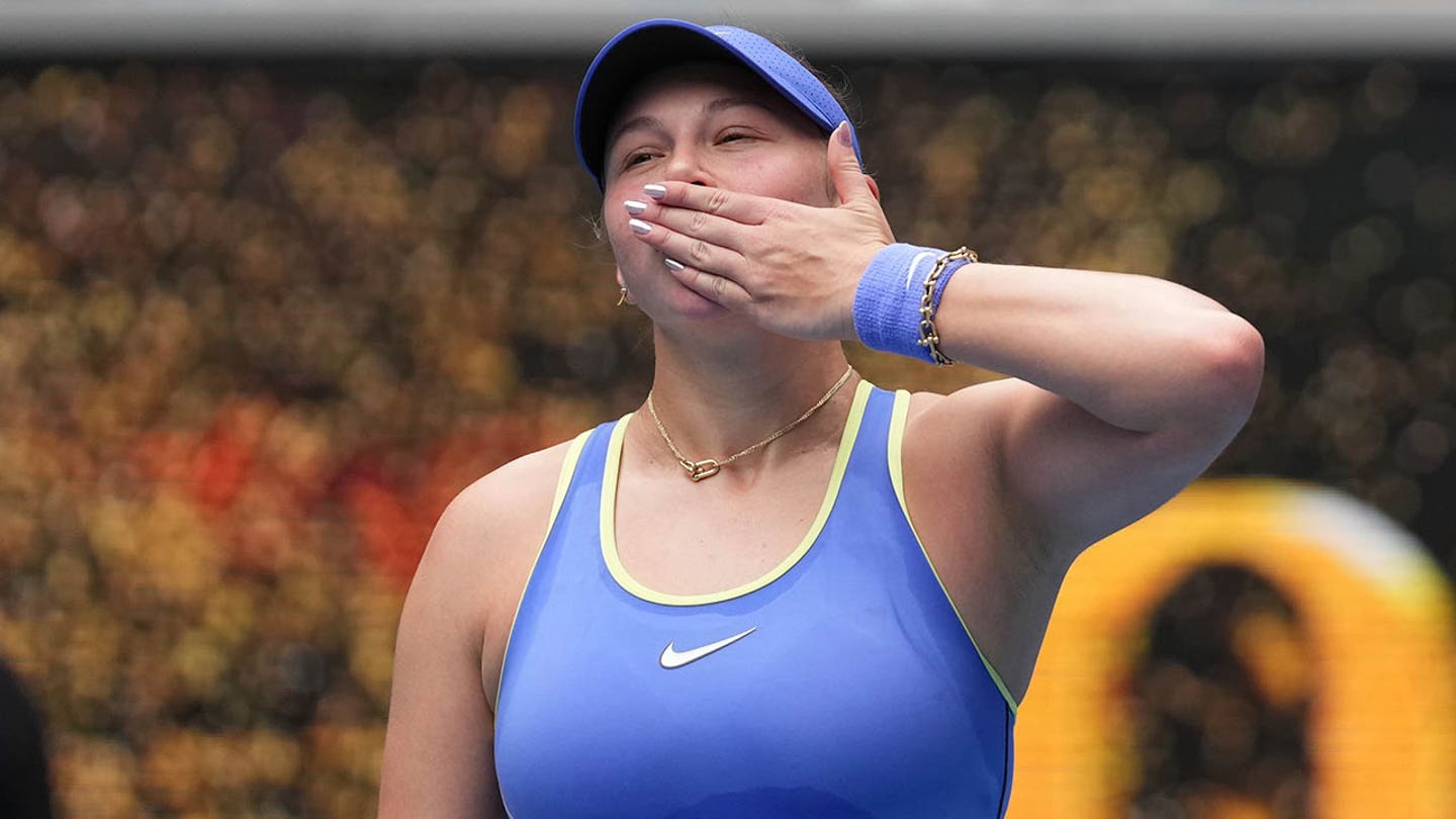 Amanda Anisimova of the U.S. reacts after defeating Katerina Siniakova of the Czech Republic in their second-round match at the Australian Open tennis championship in Melbourne, Australia, Thursday, Jan. 22, 2026. (AP Photo/Dita Alangkara)