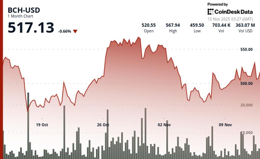 According to CoinDesk Research’s technical analysis data model, posted solid gains during the Wednesday session, advancing 1.9% from $508.32 to $518.01 amid increased volatility in the crypto markets. The move established clear bullish momentum within a trading range of $32.78, representing 6.4% intraday volatility, as BCH outperformed while most altcoins stumbled into key resistance zones.