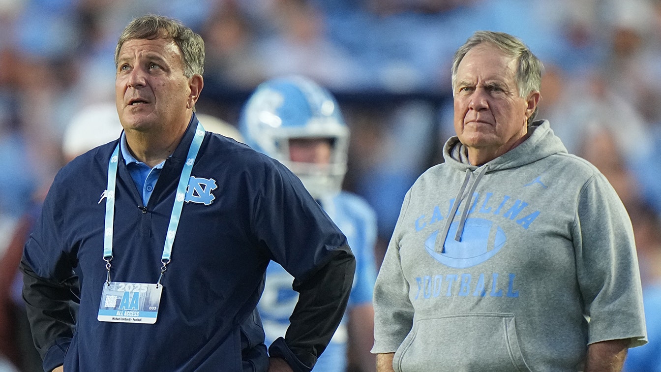 North Carolina football head coach Bill Belichick and general manager Michael Lombardi in action watch from the sideline against TCU at Kenan Memorial Stadium in Chapel Hill, North Carolina, on Sept. 1, 2025.