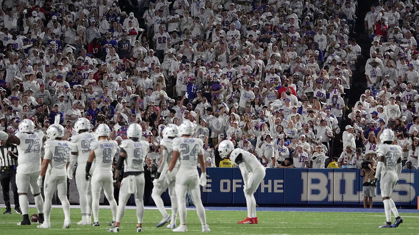 Fans were asked to wear all white for the Bills’ rivalry game against the New England Patriots during the first half at Highmark Stadium in Orchard Park, New York, on October 5, 2025. (Tina MacIntyre-Yee/Democrat and Chronicle/USA TODAY NETWORK via Imagn Images)