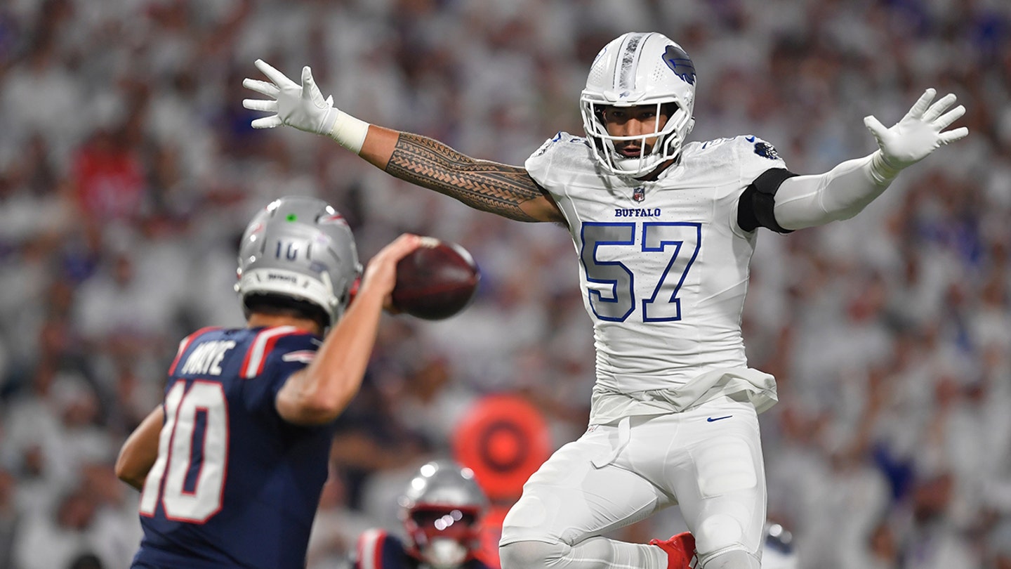 Buffalo Bills defensive end AJ Epenesa (57) pressures New England Patriots quarterback Drake Maye (10) during the first half of an NFL football game, Sunday, Sept. 5, 2025, in Orchard Park, New York. (AP Photo/Adrian Kraus)
