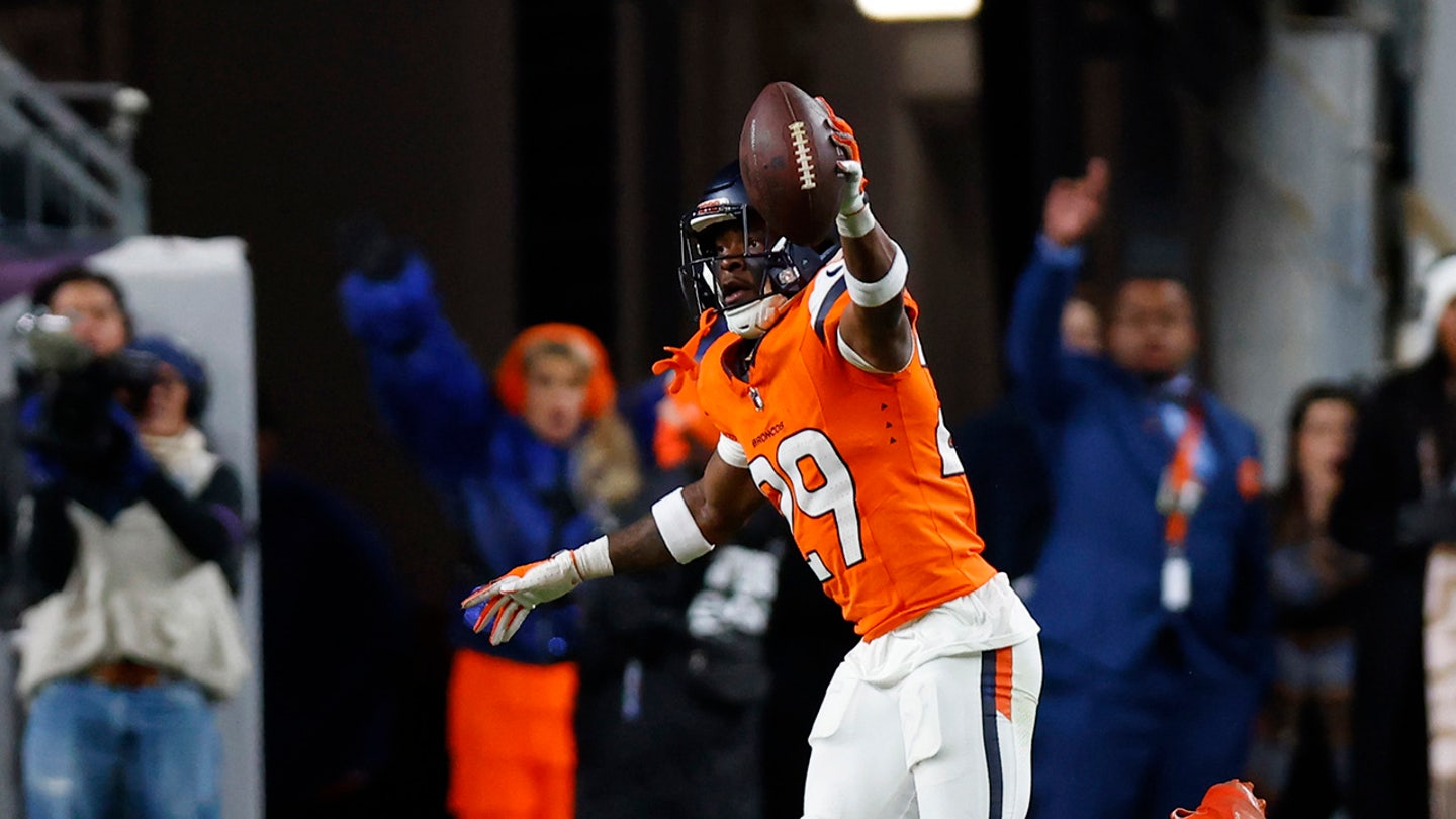 Ja’quan McMillian of the Broncos celebrates after intercepting a pass intended for Brandin Cooks of the Buffalo Bills during overtime at Empower Field At Mile High on Jan. 17, 2026 in Denver. (Justin Edmonds/Getty Images)