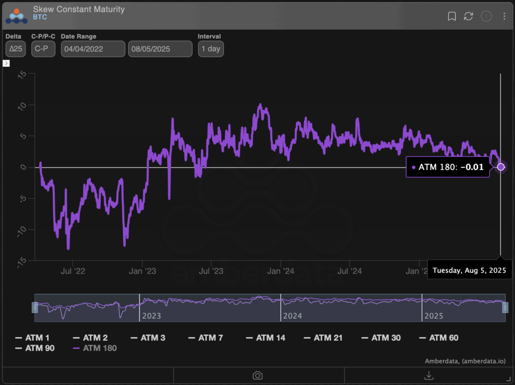 That is evident from the 180 -day bias, measuring the difference in implicit volatility (prices) between the options for the call and sale of money out of money. The metric has recently retired to zero, according to the Amber Data Source, indicating that the feeling of the long -term market has changed from bullish to neutral. The change occurs when some analysts warn about a bearish market in 2026.