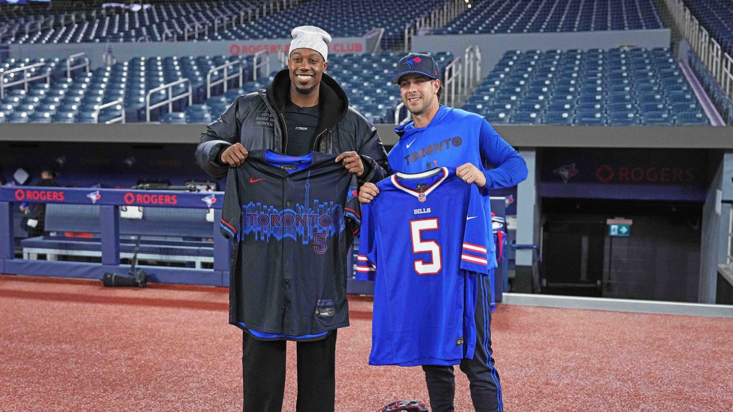 The open receiver of Buffalo Bills, Joshua Palmer, poses for a photo with the third base of the Toronto Blue Jays, Ernie Clement (22) during batting practice before a game against Baltimore’s orioles at the Rogers Center. (Images Nick TURCHIARO/IMAGN)