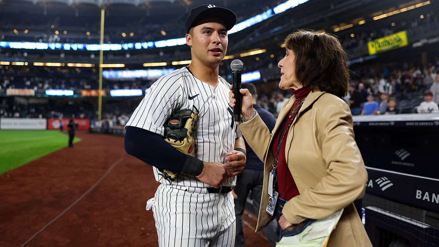 Anthony Volpe of the New York Yankees is interviewed after the game against the San Diego Padres at Yankee Stadium, May 6, in New York, New York. (New York Yankees/Getty Images)