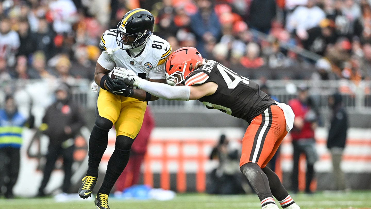 Jonnu Smith of the Pittsburgh Steelers catches a pass against Carson Schwesinger #49 of the Cleveland Browns during the third quarter at Huntington Bank Field on December 28, 2025 in Cleveland, Ohio. (Nick Cammett/Diamond Images)