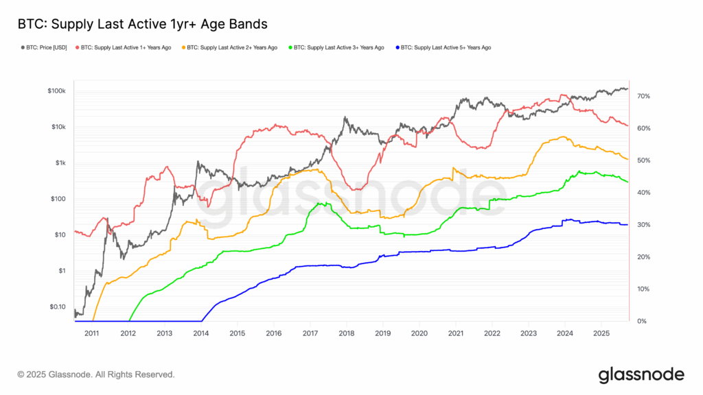 The three -year -old cohort is now just above 43% and has been constantly falling since November 2024. These wallets largely represent buyers of the previous cycle in November 2021 in around $ 69,000, many of which accumulated more during the 2022 bearish market when the prices reach the low of $ 15,500. With the recovery of Bitcoin, these investors are obtaining profits.