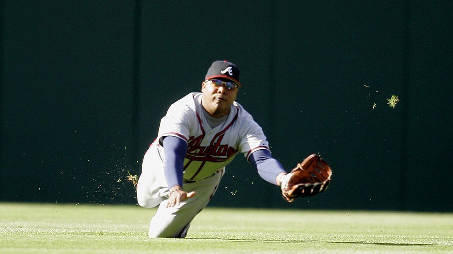 Atlanta Braves outfielder Andruw Jones makes a diving catch against the Philadelphia Phillies on April 16, 2005. (Tom DiPace/Sports Illustrated via Getty Images)