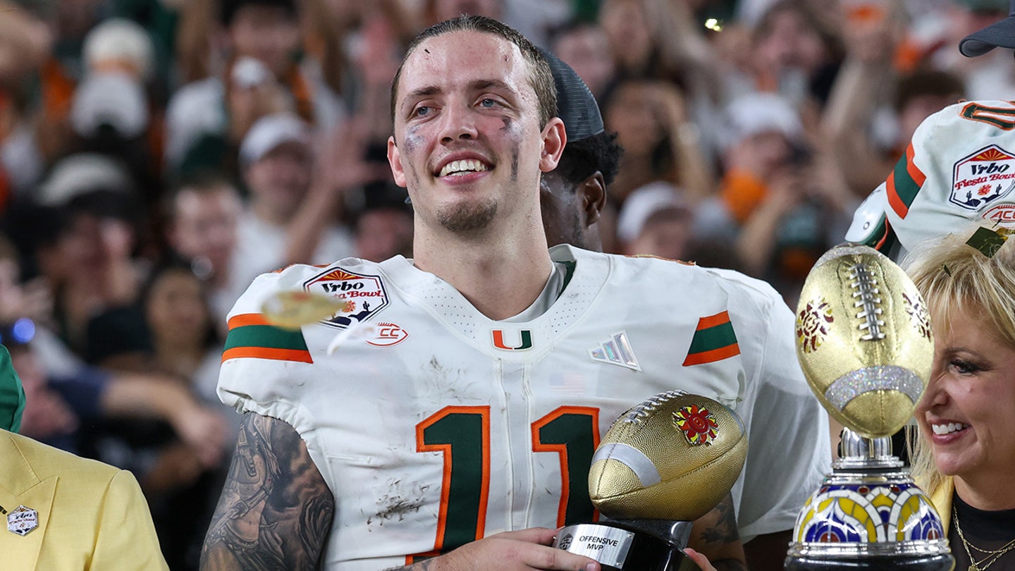 Carson Beck of the Miami Hurricanes smiles after leading his team to victory over the Ole Miss Rebels in the College Football Playoff semifinal at the Vrbo Fiesta Bowl on Jan. 8, 2026, at State Farm Stadium in Glendale, Arizona. (David Buono/Icon Sportswire via Getty Images)