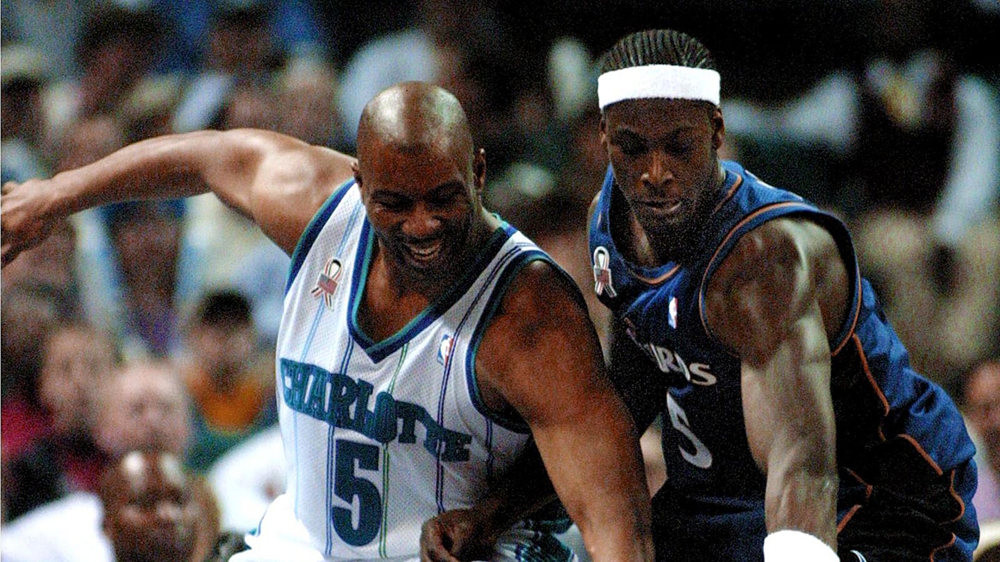Kwame Brown (right) of the Washington Wizards strips the ball from Elden Campbell (left) of the Charlotte Hornets in the second half at the Charlotte Coliseum in Charlotte, North Carolina, on April 5, 2002. (NELL REDMOND/AFP via Getty Images)