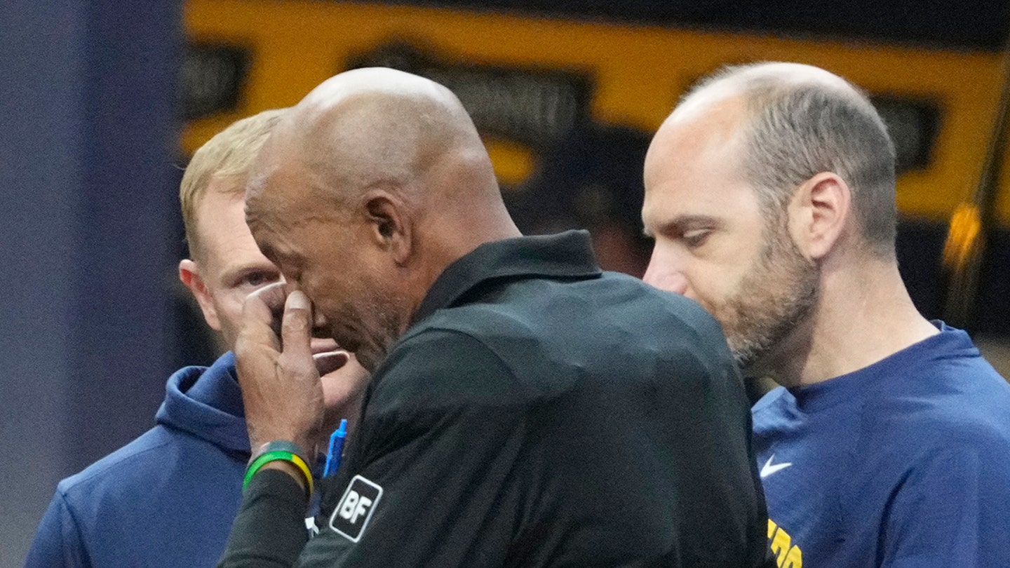 Umpire CB Bucknor is injured in the second inning by a foul ball and leaves during the game between the Milwaukee Brewers and the Tampa Bay Rays at American Family Field on April 1, 2026 in Milwaukee, Wisconsin. (John Fisher/Getty Images)