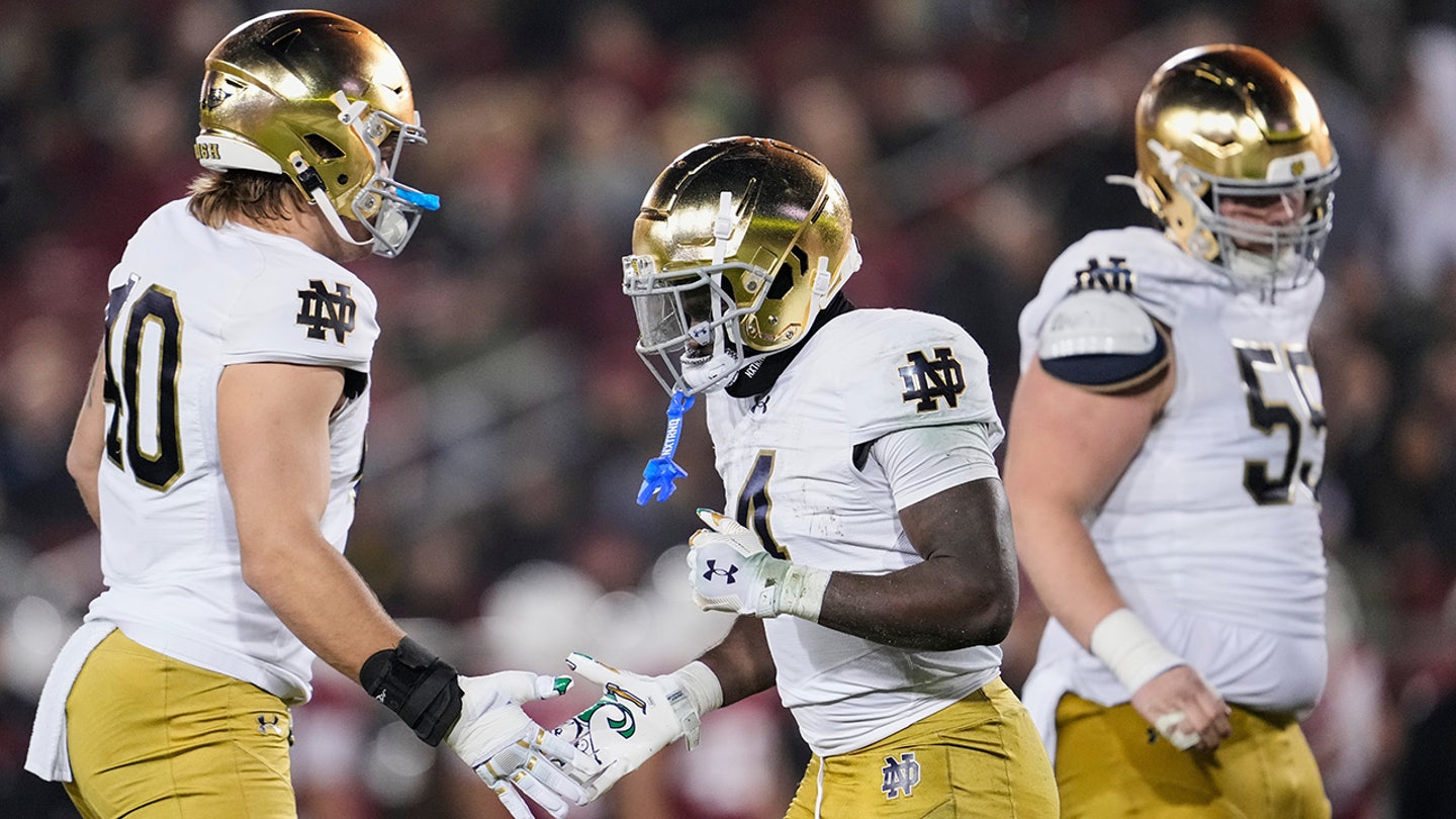 Notre Dame running back Jeremiyah Love, center, celebrates with teammates after scoring a touchdown during the first half of an NCAA college football game against Stanford, Saturday, Nov. 29, 2025, in Stanford, California. (AP Photo/Godofredo A. Vásquez)