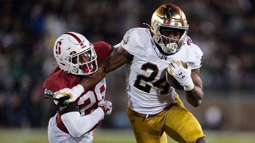 Notre Dame running back Jadarian Price (24) is tackled by Stanford safety Darrius Davis (29) during the first half of an NCAA college football game, Saturday, Nov. 29, 2025, in Stanford, California. (AP Photo/Godofredo A. Vásquez)