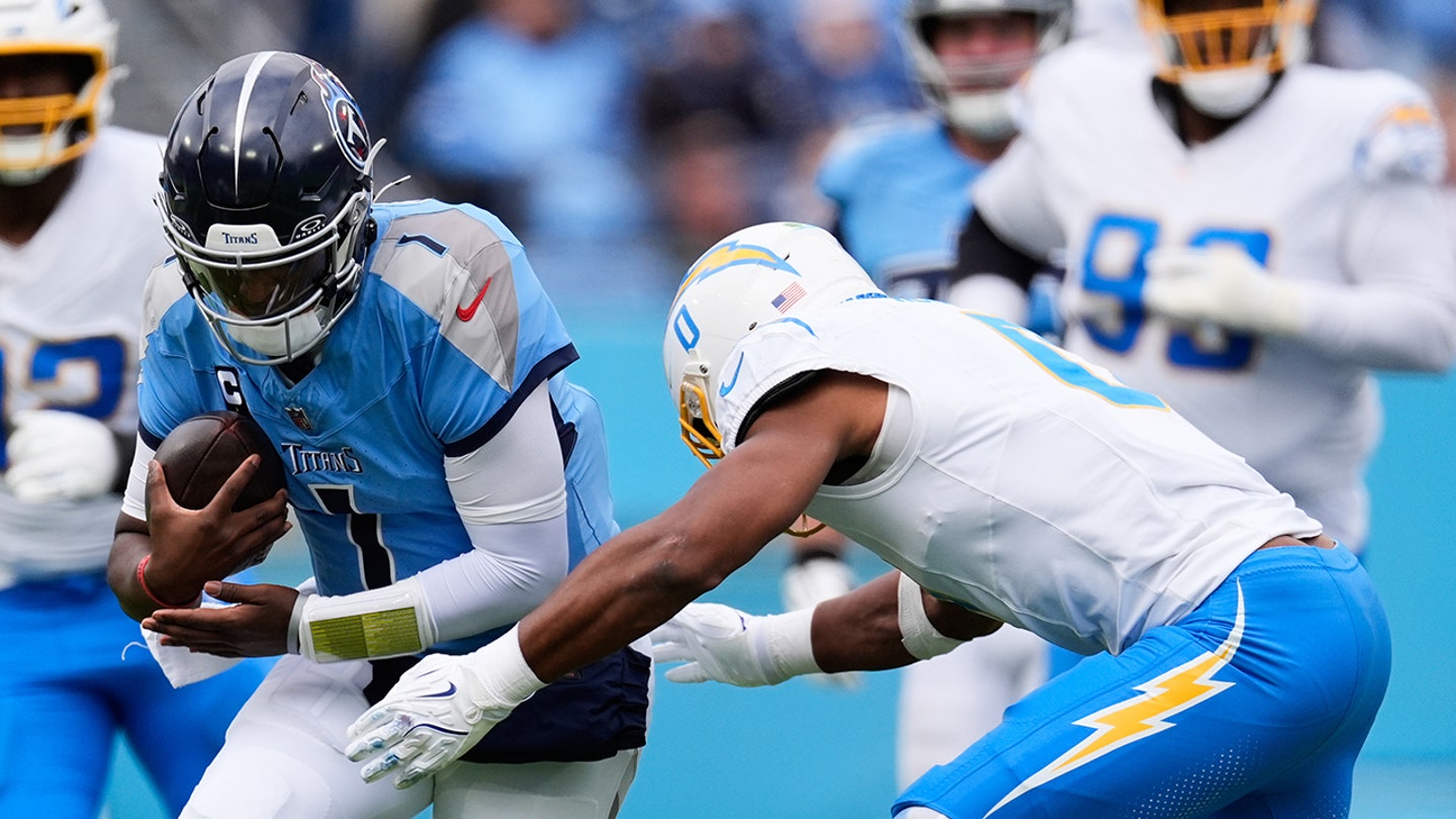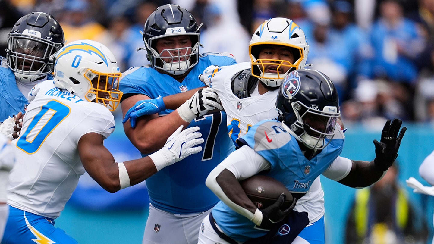 Tennessee Titans running back Tyjae Spears (2) passes by Los Angeles Chargers linebacker Daiyan Henley (0) during the second half of an NFL football game on Sunday, Nov. 2, 2025 in Nashville, Tennessee. (AP Photo/George Walker IV)