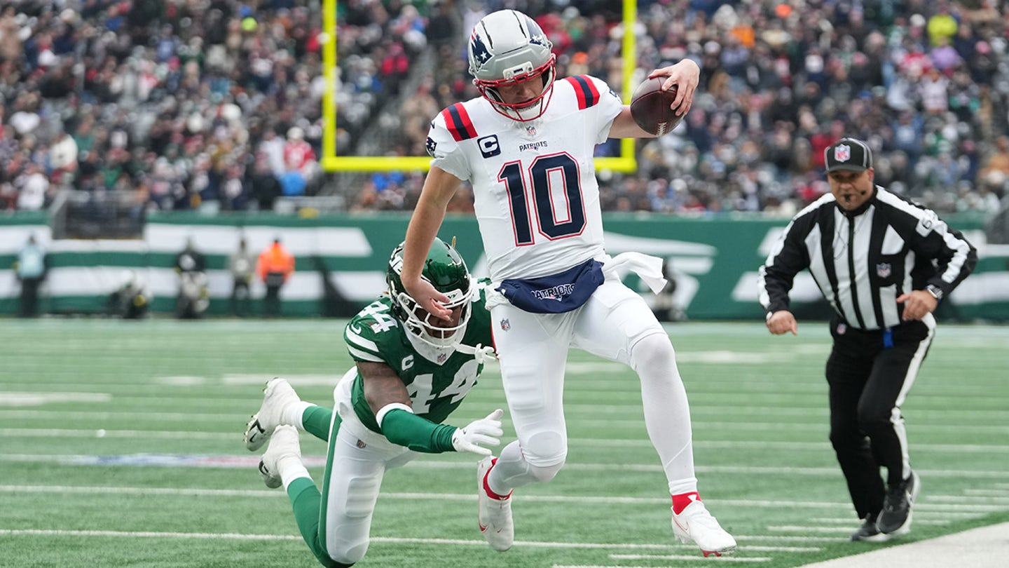Drake Maye threw a career-high five touchdown passes and the Patriots finished the regular season undefeated on the road with a 42-10 victory over the Jets.