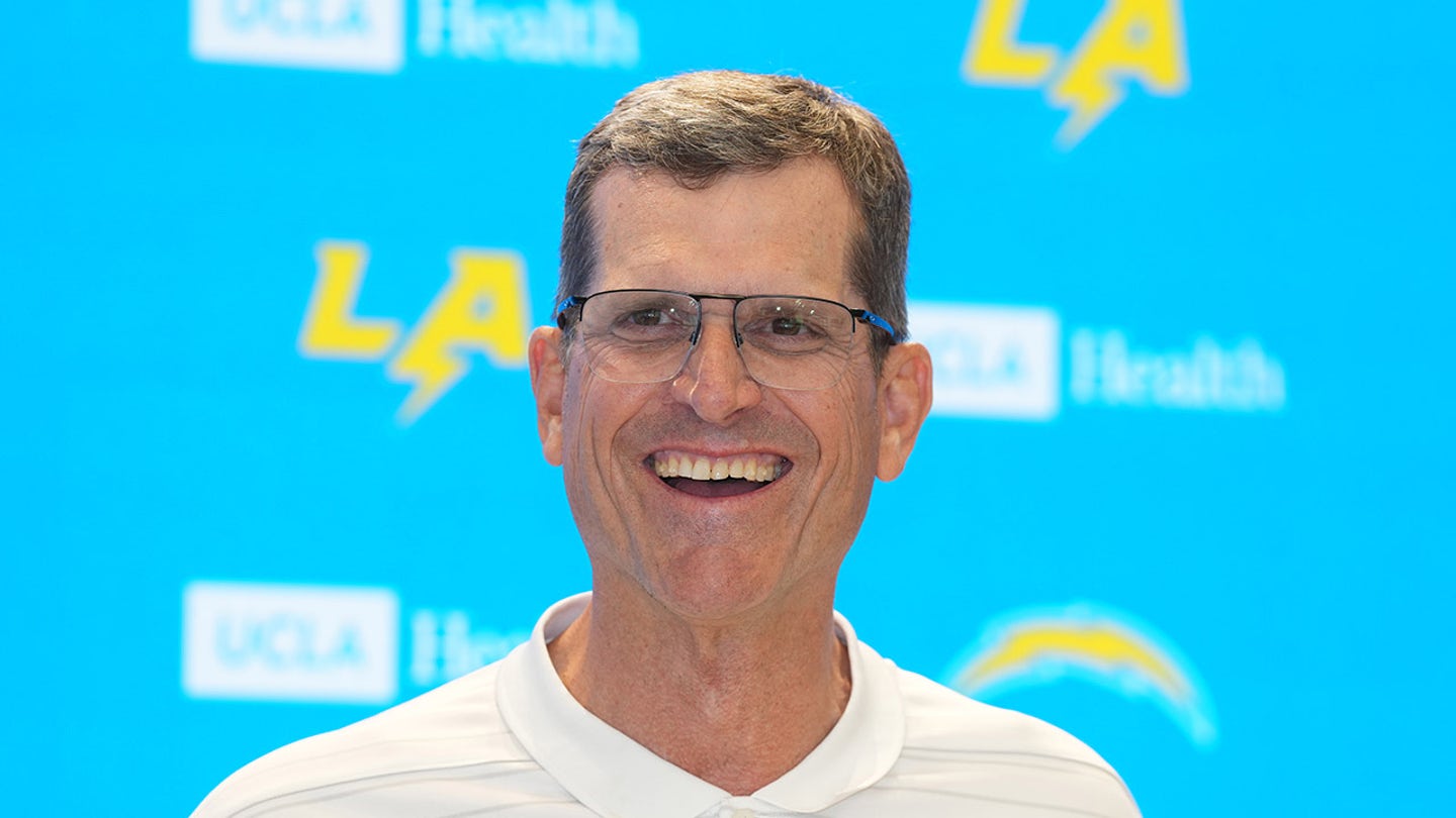 Los Angeles Chargers coach Jim Harbaugh during a press conference at The Bolt in El Segundo CA, USA on May 7, 2025. (Kirby Lee/Image Images)