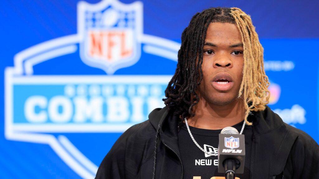 Quinshon Judkins, of the state of Ohio, speaks with the media during the NFL combines in Lucas Oil Stadium on February 28, 2025 in Indianapolis, Indiana. (Justin Casterline/Getty Images)