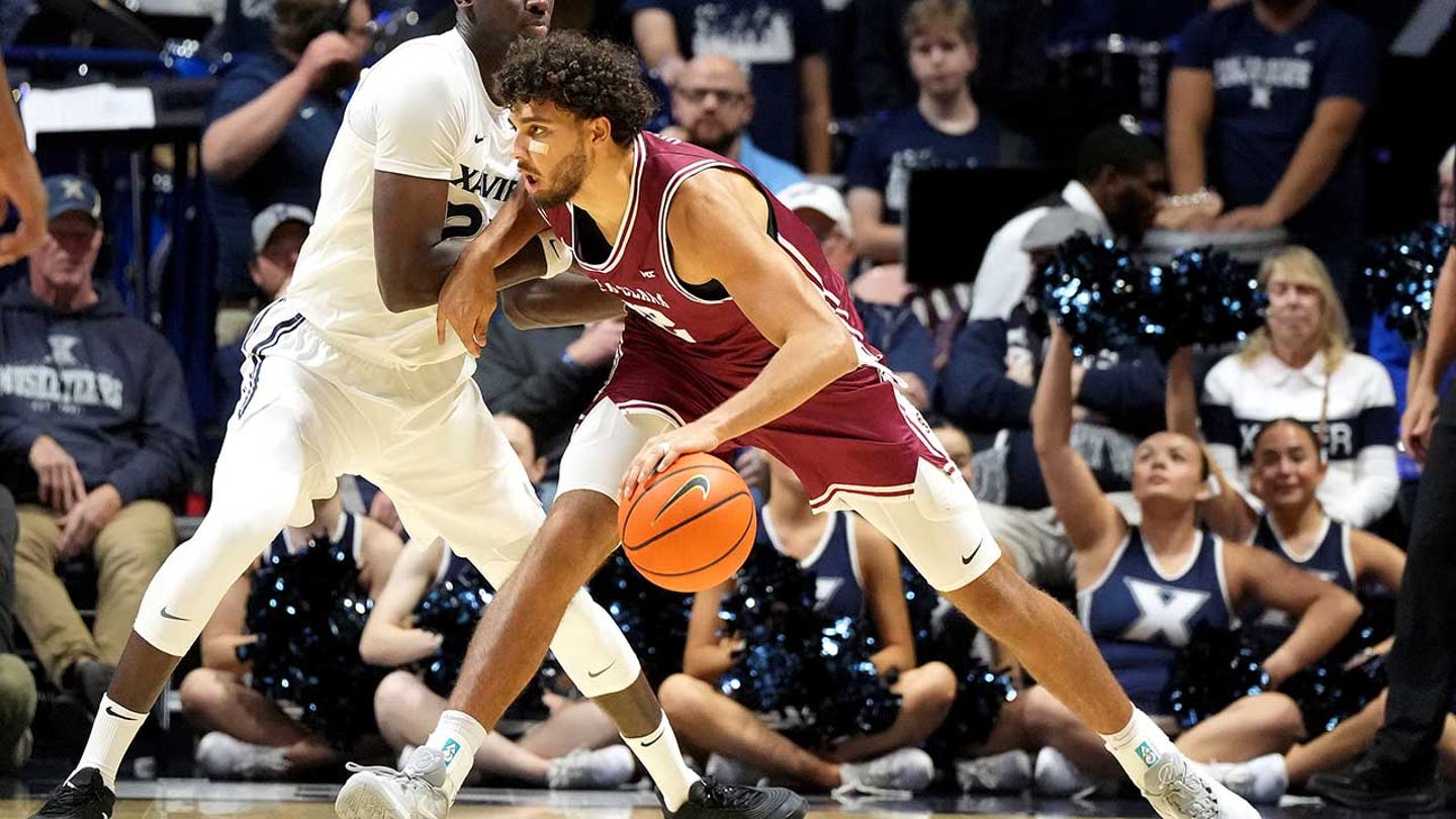 Allen Graves (22) of the Santa Clara Broncos dribbles the ball during a college basketball game against the Xavier Musketeers at the Cintas Center in Cincinnati, Ohio, on Nov. 10, 2025. (Mitchell Layton/Getty Images)