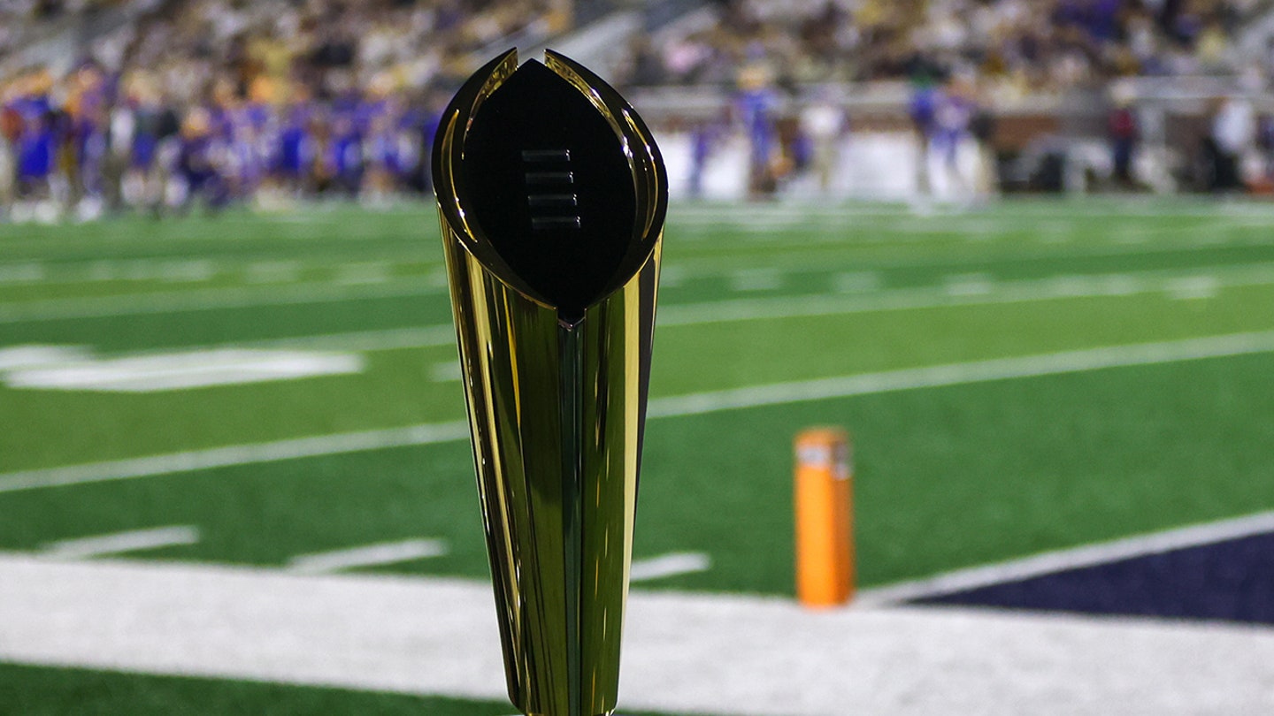 A view of the College Football Playoff National Championship Trophy on the sidelines of a game between the Georgia Tech Yellow Jackets and the Pittsburgh Panthers in the fourth quarter at Bobby Dodd Stadium at Hyundai Field on November 22, 2025 in Atlanta, Georgia. (Brett Davis/Image Images)