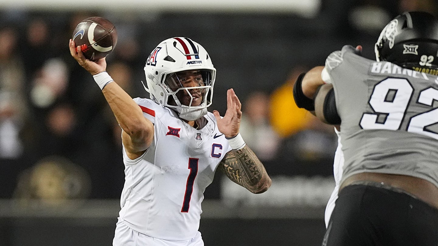 Arizona quarterback Noah Fifita, left, passes the ball as Colorado defensive tackle Anquin Barnes Jr. covers in the second half of an NCAA college football game Saturday, Nov. 1, 2025, in Boulder, Colorado. (AP Photo/David Zalubowski)