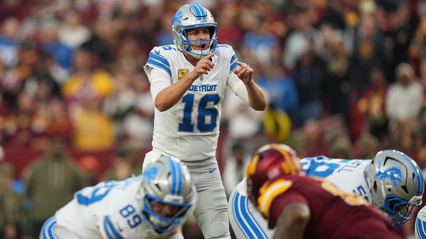 Detroit Lions quarterback Jared Goff (16) calls a play at the line of scrimmage during the first half of an NFL football game against the Washington Commanders on Sunday, Nov. 9, 2025 in Landover, Maryland. (AP Photo/Stephanie Scarbrough)