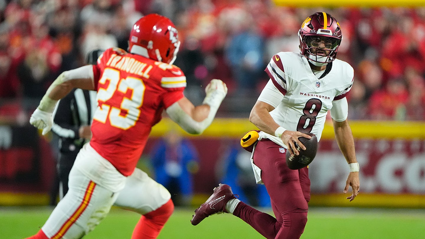Washington Commanders quarterback Marcus Mariota (8) battles as Kansas City Chiefs linebacker Drue Tranquill (23) defends during the first half of an NFL football game Monday, Oct. 27, 2025 in Kansas City, Missouri. (AP Photo/Charlie Riedel)