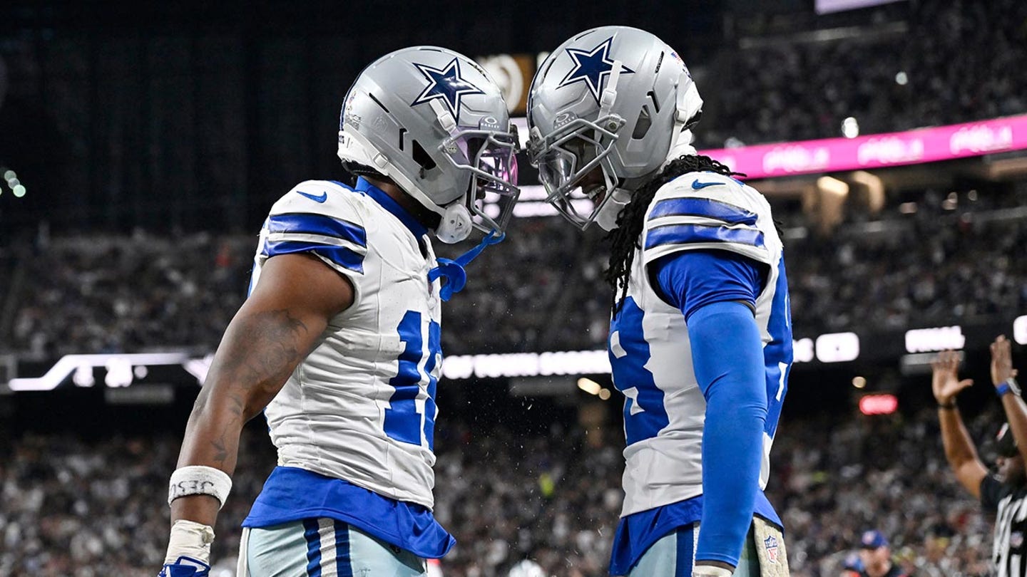 George Pickens and CeeDee Lamb of the Dallas Cowboys celebrate a touchdown during the second quarter against the Las Vegas Raiders at Allegiant Stadium on November 17, 2025 in Las Vegas, Nevada. (Ian Maule/Getty Images)