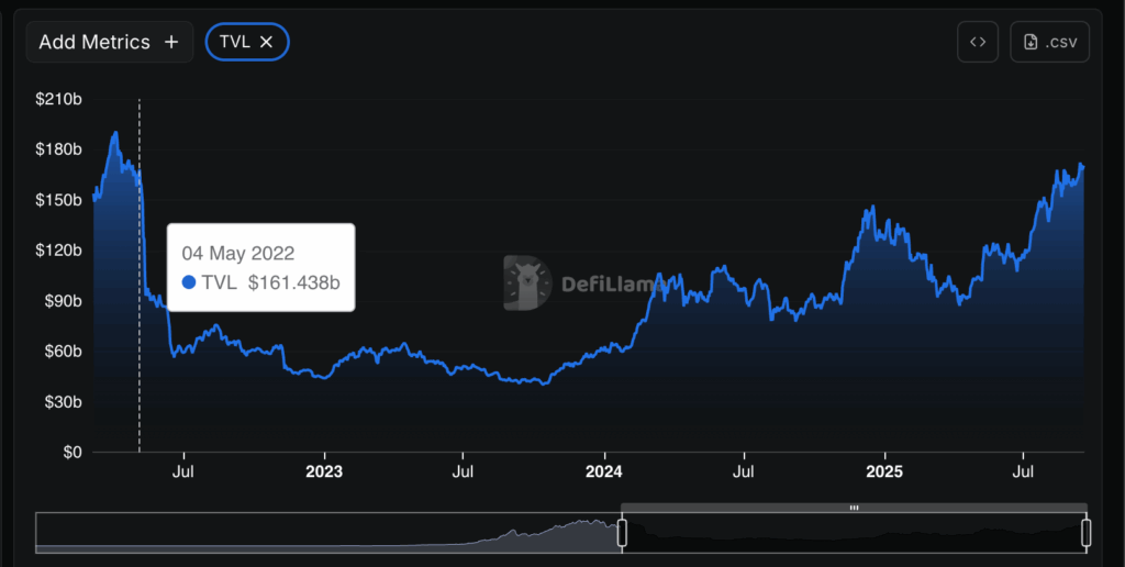 The previous bullish market between January 2021 and April 2022 saw rapid growth throughout the defi ecosystem, with TVL jumping from $ 16 billion to $ 202 billion. This cycle has been measured more with a slow but constant gain of $ 42 billion in October 2022 to $ 170 billion in September 2025.