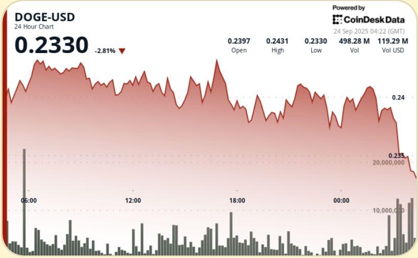 Consolidated in a tight band during the 24 -hour window from September 23 at 03:00 to September 24 at 02:00, quoting between $ 0.236 and $ 0.244. The first demonstrations at 06:00 and 16:00 tested the $ 0.244 mark, but the repeated profits limited the upward impulse.