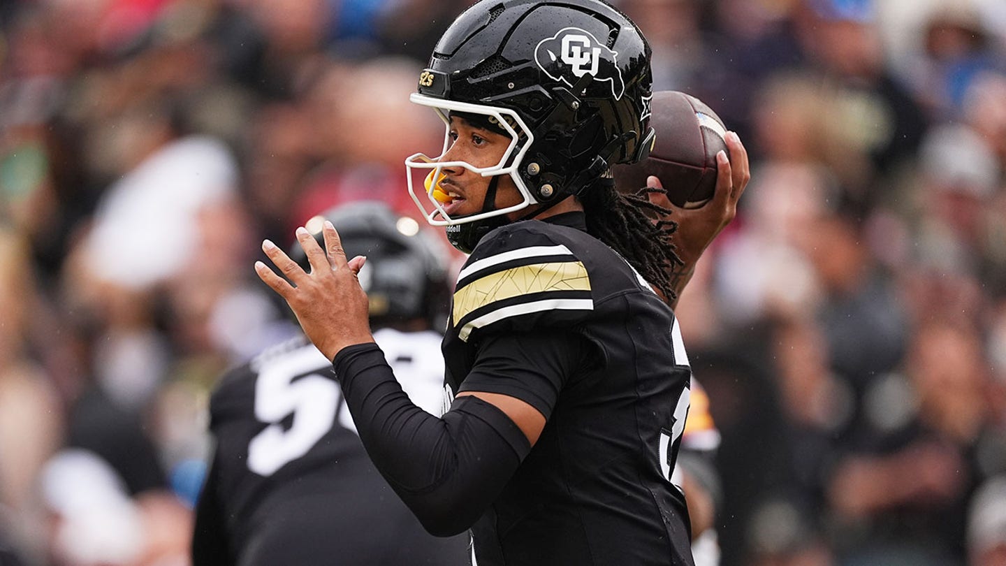 Colorado quarterback Kaidon Salter throws a pass against Iowa State in the first half of an NCAA college football game on Saturday, Oct. 11, 2025, in Boulder, Colorado. (AP Photo/David Zalubowski)