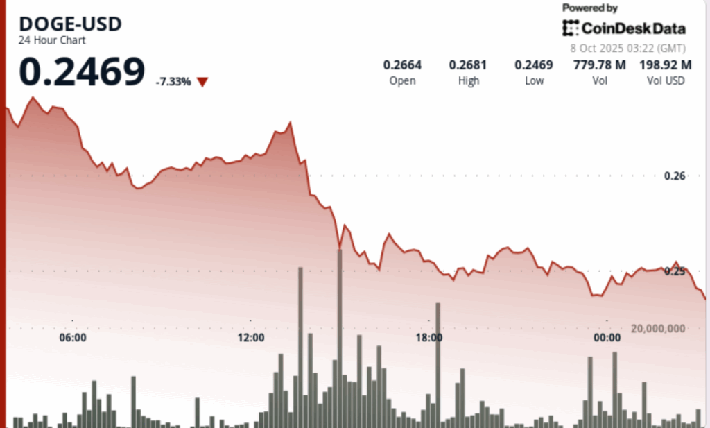 Dogecoin fell 8% in trading on Tuesday as whales unloaded resistance at $0.27 before swinging back to near $0.25. A sell-off of 1 billion tokens marked the day’s lows, but late-breaking prints showed the smart money pulling back, hinting at a possible bottom.