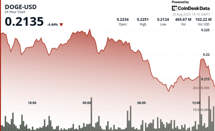• Doge fell 5% during the 24 -hour session from August 28 at 09:00 to August 29 at 08:00, sliding from $ 0.22 to $ 0.21.