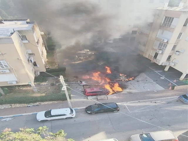 Smoke and flames rise from vehicles after shrapnel from an Iranian missile attack landed on a parking lot in Ramat Gan, Israel, in this screenshot from a video obtained from social media. Photo: Reuters