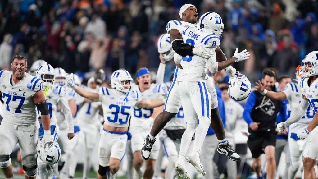 Duke’s Dan Mahan (12) celebrates defeating the Virginia Cavaliers during the 2025 ACC Championship game at Bank of America Stadium. (Jim Dedmon/Image Images)