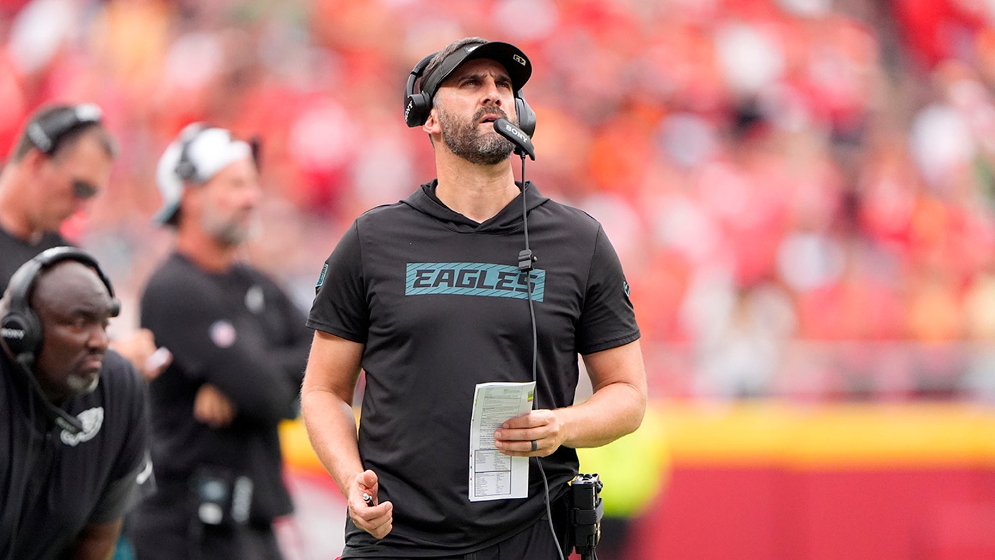 Philadelphia Eagles head coach Nick Sirianni watches from the sidelines during the second half of an NFL football game against the Kansas City Chiefs on Sunday, Sept. 14, 2025, in Kansas City, Missouri. (AP Photo/Charlie Riedel)