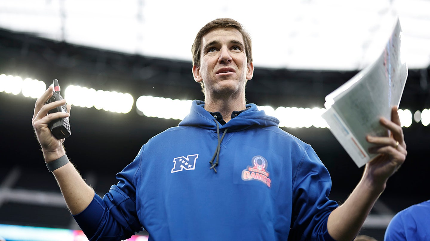 NFC head coach Eli Manning leads a huddle during a practice session ahead of the NFL Pro Bowl at Allegiant Stadium in Las Vegas, Nevada, on Feb. 4, 2023. (Michael Owens/Getty Images)