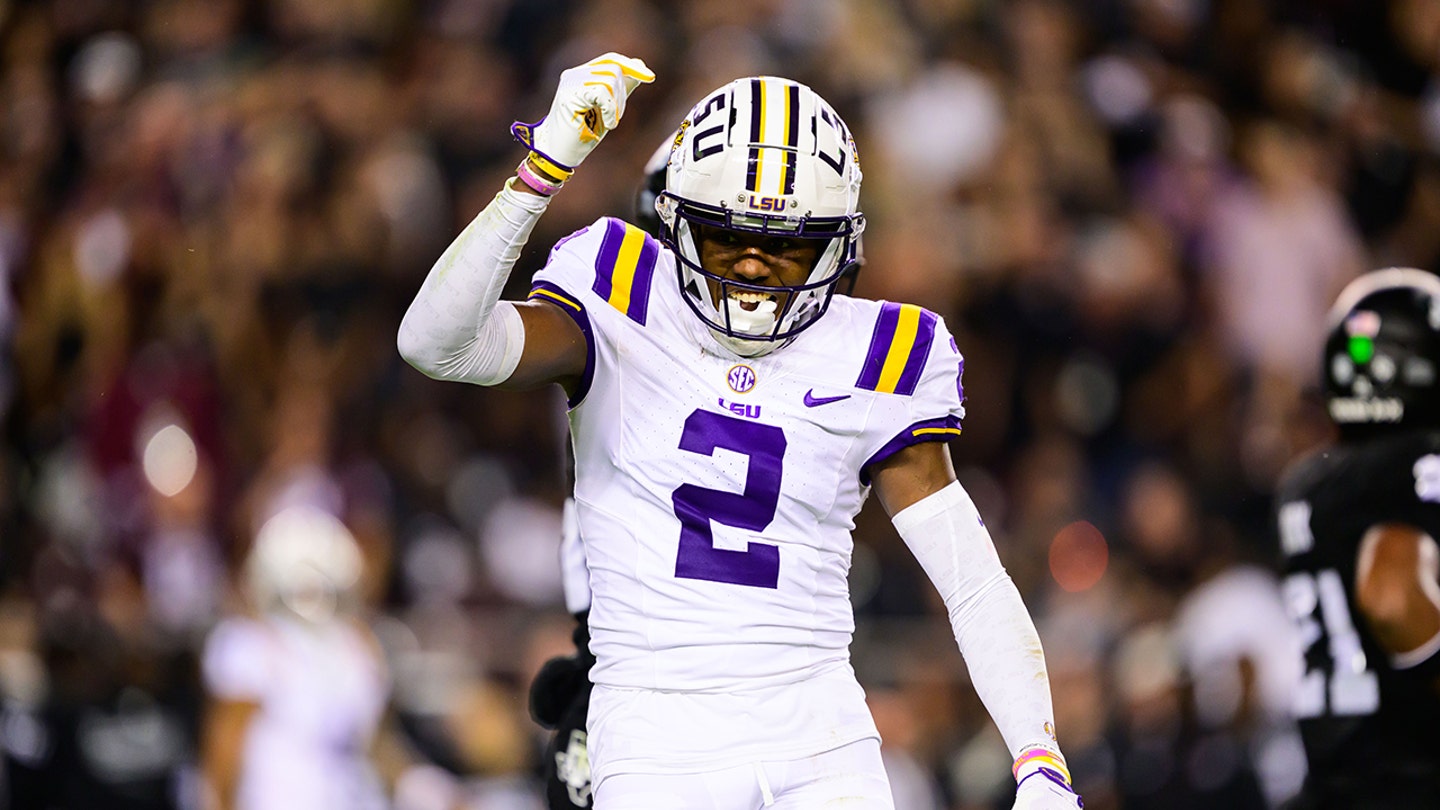 Kyren Lacy of the LSU Tigers celebrates a sack during the second quarter against the Texas A&M Aggies at Kyle Field on October 26, 2024 in College Station, Texas. (Gus Stark/LSU/University Images via Getty Images)